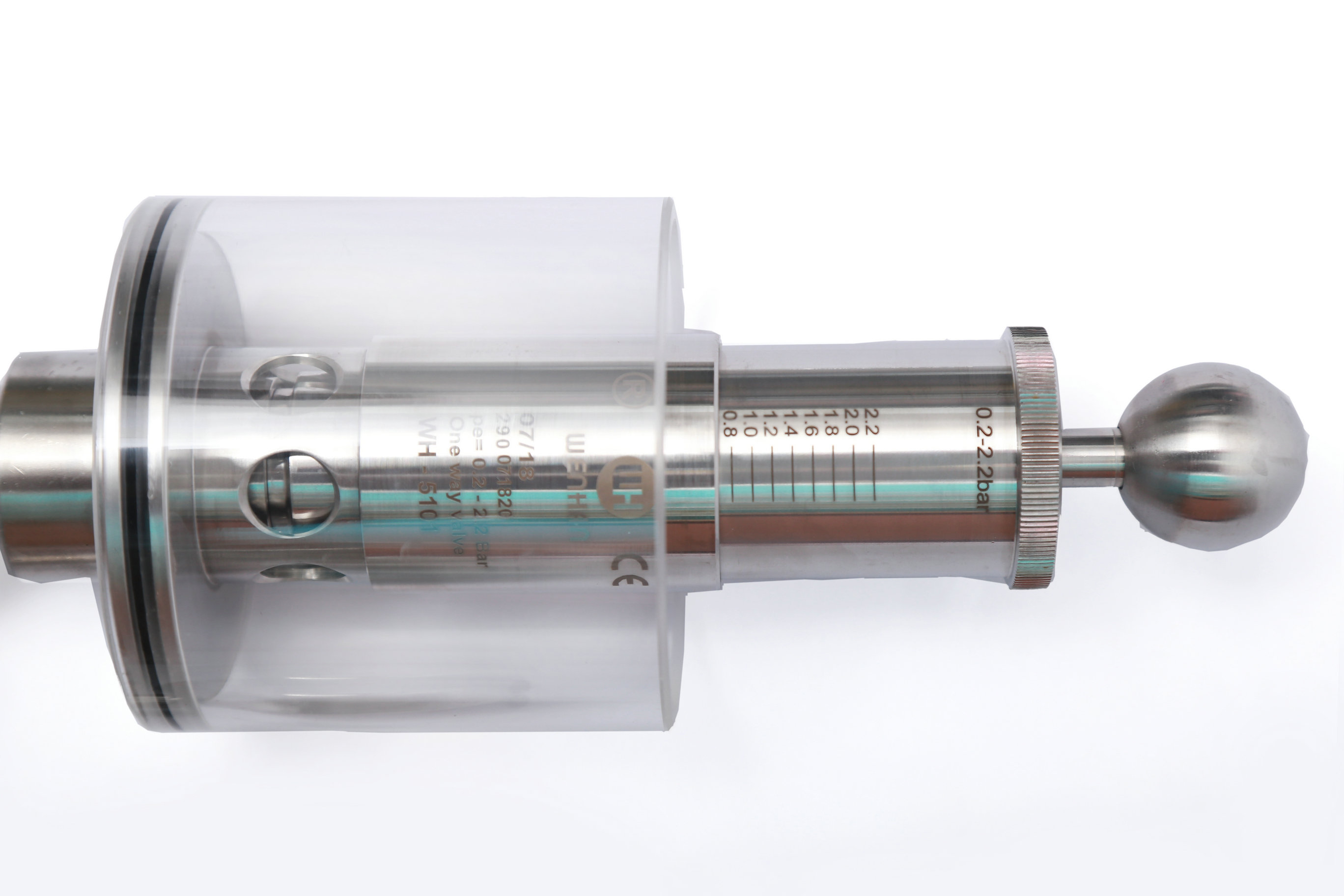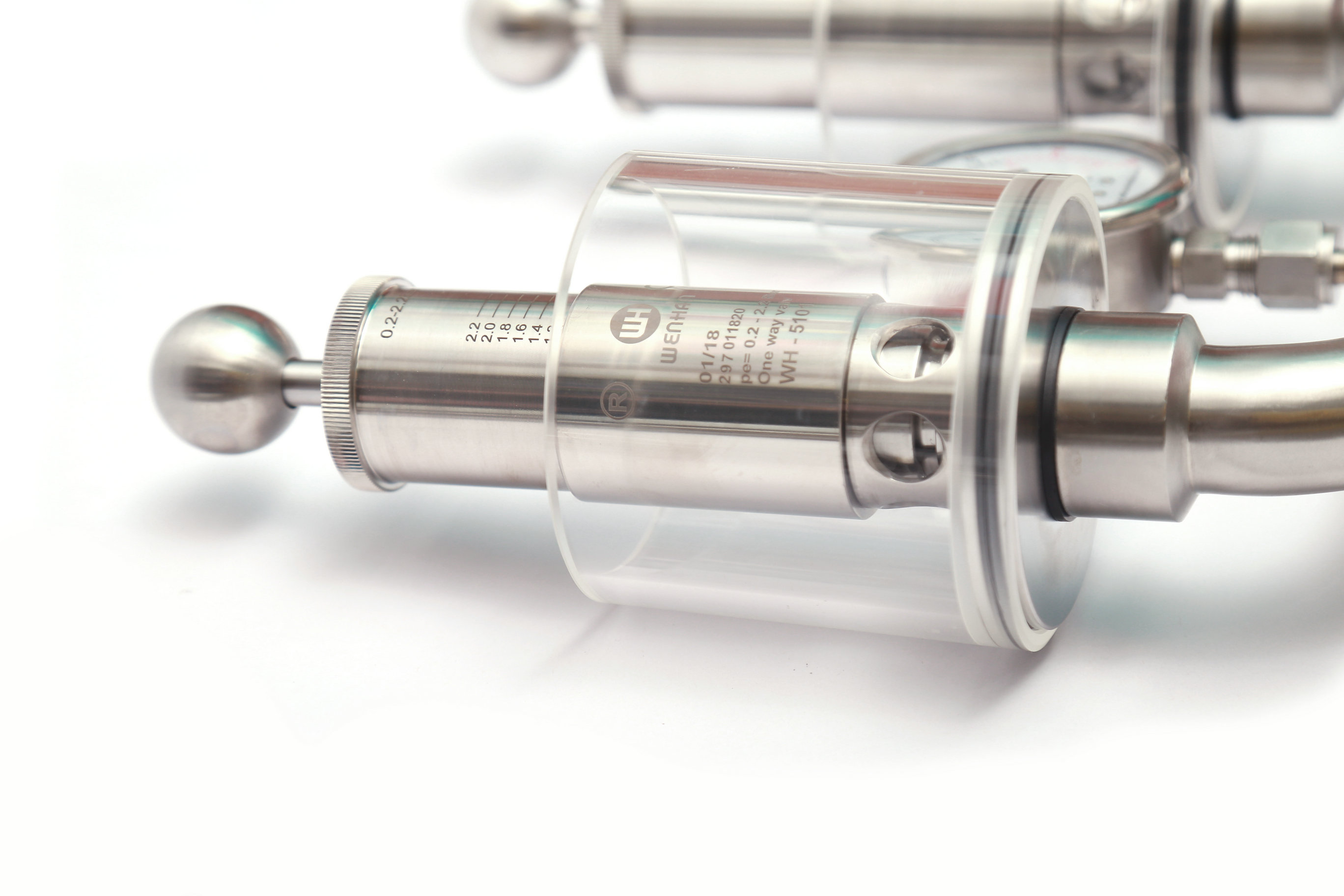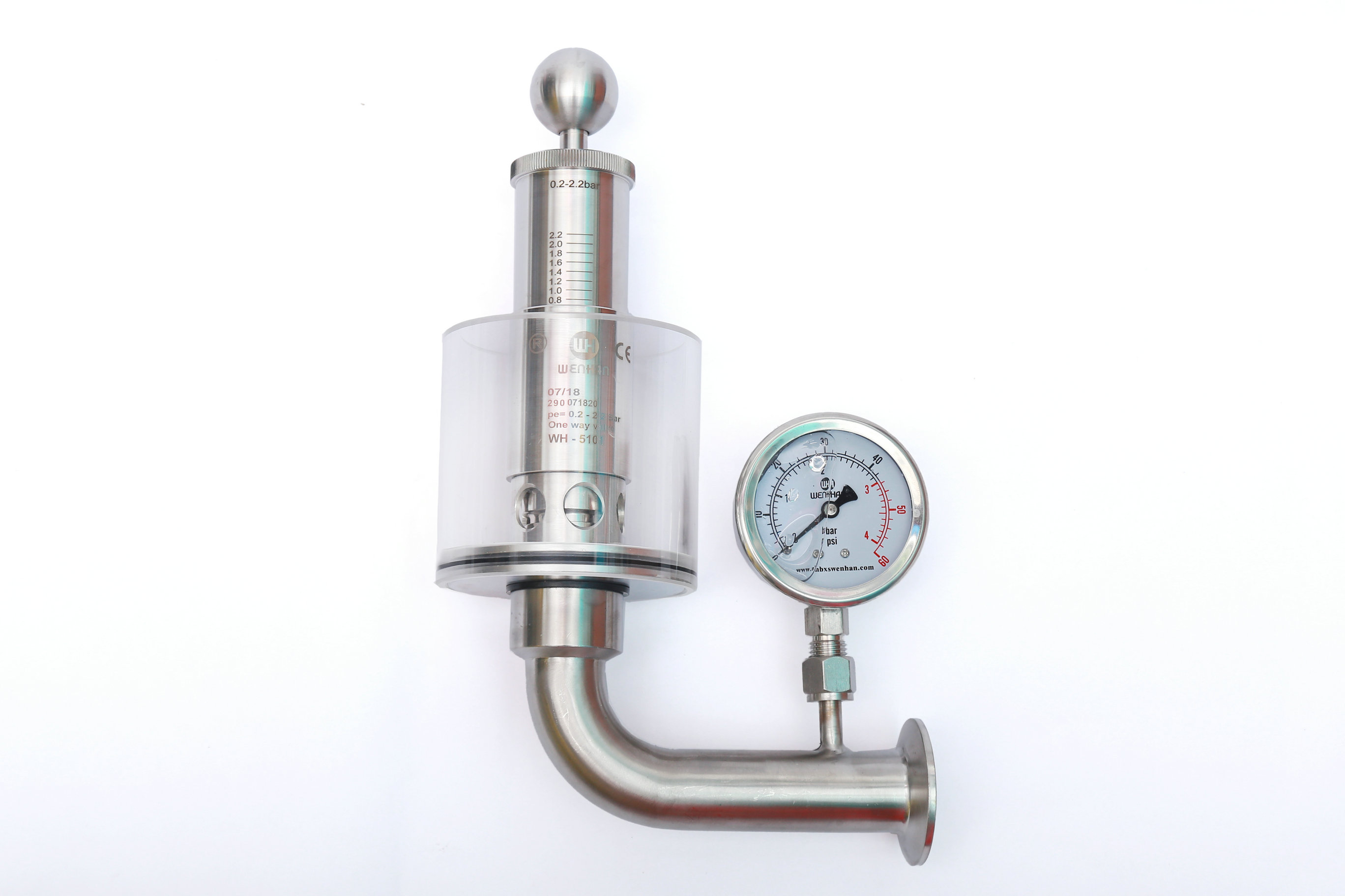 調節單向排氣閥保護容器壓力過高防爆作用,當壓力高于設定壓力(標準1BAR)時可以排氣,反之關閉,調節桿標上壓力刻度,所需壓力按刻度上調整,該閥門使用方便,刻度準確,玻璃罩加水能看到發酵效果,減少染菌。同時也可以滿足于各種生產工藝需求,適用于各種食品加工,啤酒,飲料以及制藥等各種工業領域。